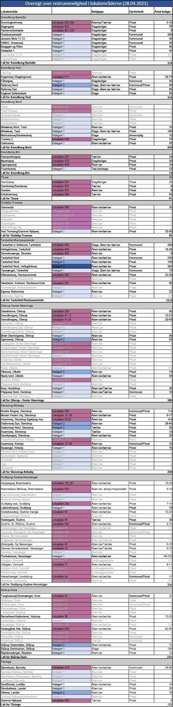 På nedenstående skema fremgår den aktuelle restrummelighed, der viser hvor der er uudnyttede kommuneplanrammer til boligformål i de forskellige lokalområder.