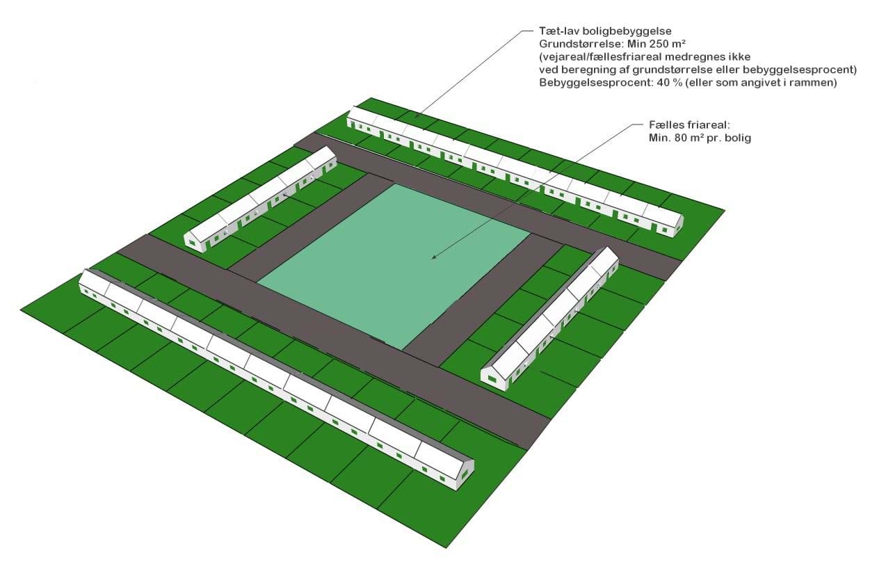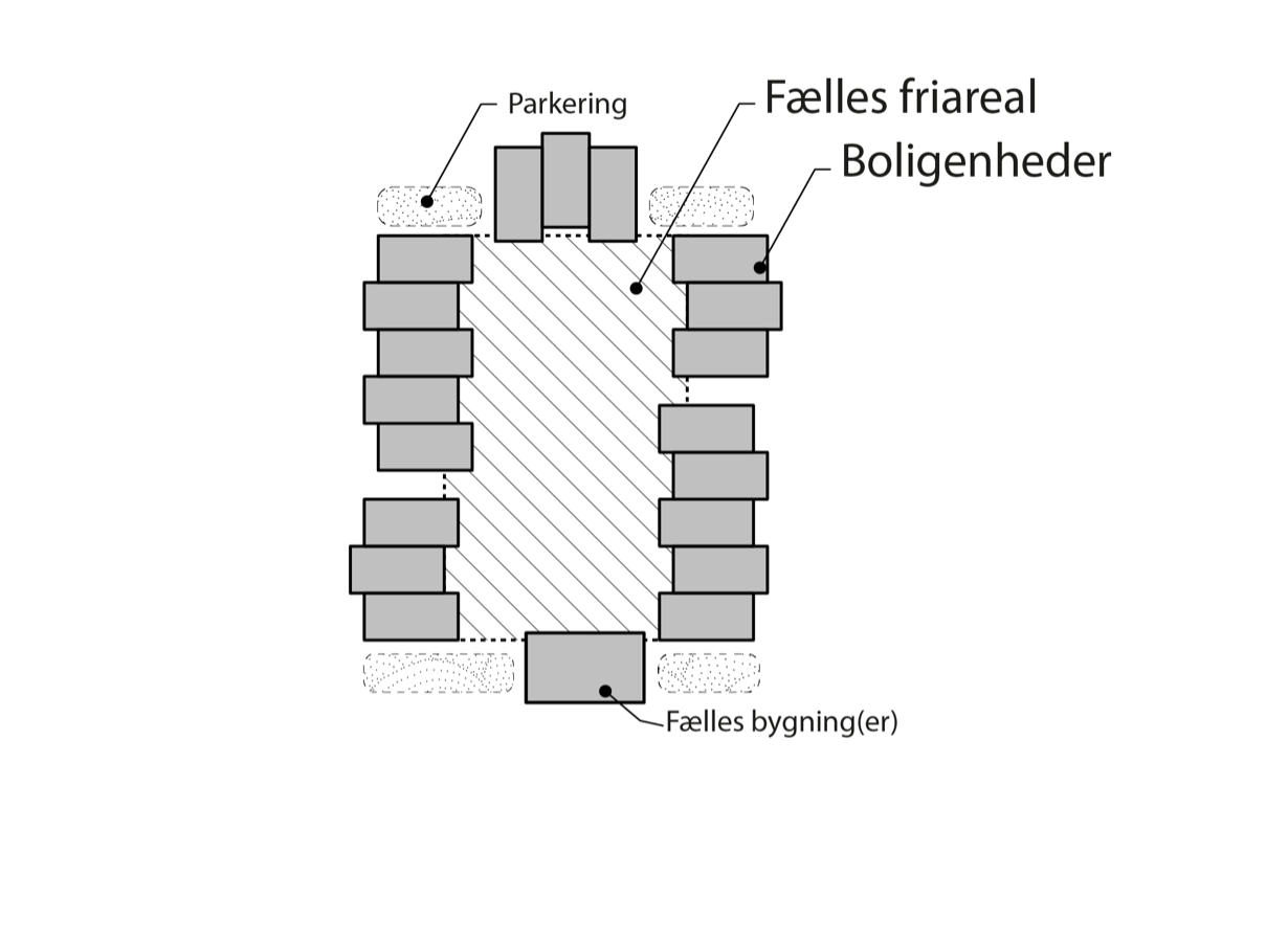 - Fællesarealerne prioriteres fremfor de private haver, for at understøtte boligområder med fokus på fællesskaber, som f.eks. bofællesskaber og lignende boligtypologier.