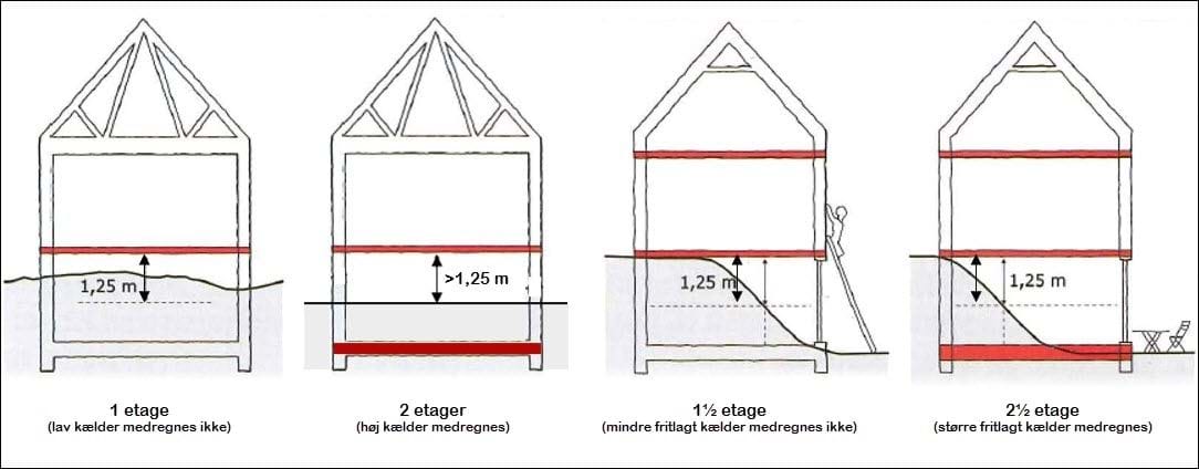 Det maksimalt tilladelige antal etager er inklusiv tagetage og kælder, hvis kælderloftet ligger mere end 1,25 m over naturligt terræn. Se illustration herunder.