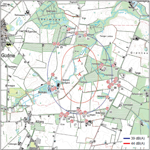 Der udlægges derfor en støjkonsekvenszone omkring vindmøllerne som det fremgår af nedenstående støjkonsekvenskort.