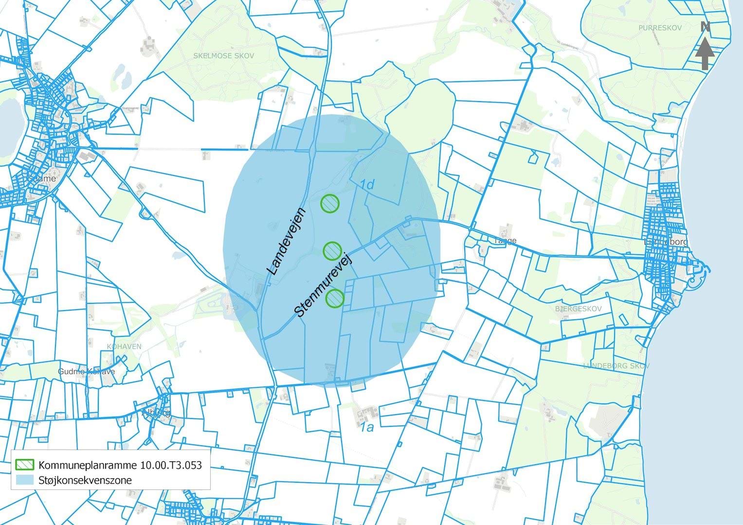 Støjkonsekvenszone omkring kommuneplanramme 10.00.T3.05.