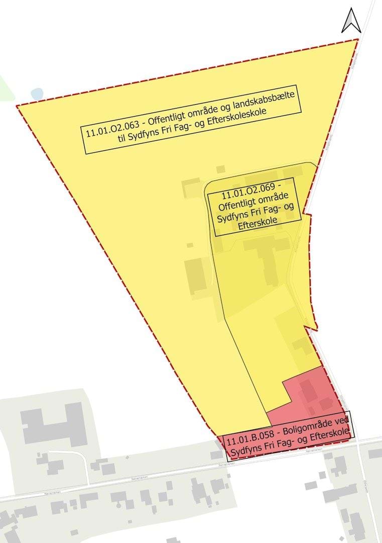 Fremover vil den eksisterende kommuneplanramme 11.01.O2.069 - Offentligt område Sydfyns Fri Fag- og Efterskole dække skolens eksisterende og fremtidige bebyggelse som placeres i byzone. En stor del af skolens areal bruges til hestefold og der udlægges en ny offentlig ramme i området, som udvides mod nord og hvor der gives mulighed for at placere solcellepaneler på terræn med en maksimal størrelse på 1 ha. Dette skal understøtte skolens energiforsyning og den grønne omstilling.