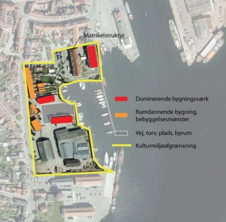 Specifikke bestemmelser: Pladsen mellem de to pakhuse er fredet og der må kun i begrænset omfang etableres bebyggelse.