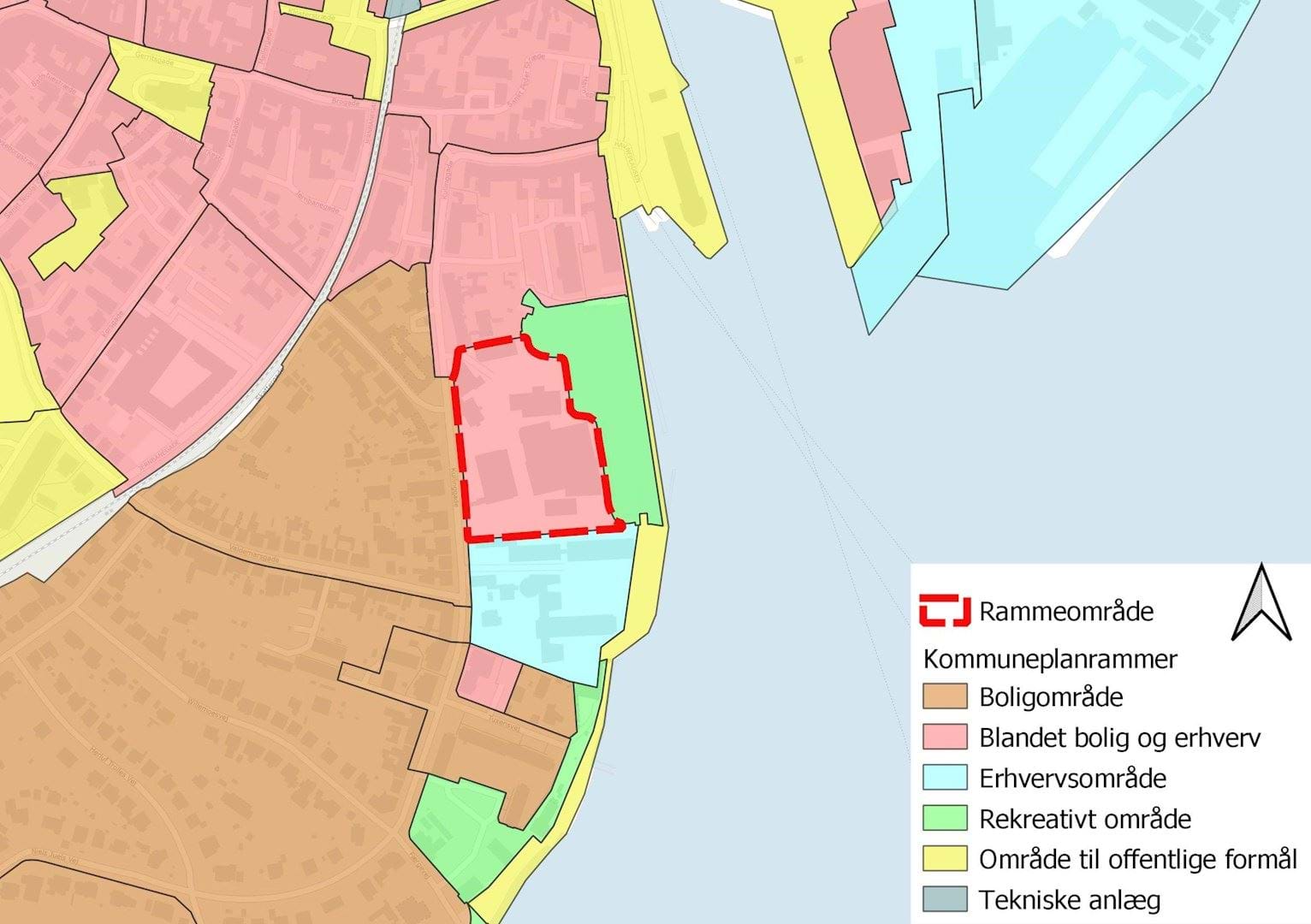 Kort over rammeområdet og omkringliggende kommuneplanrammer med anvendelser vist.