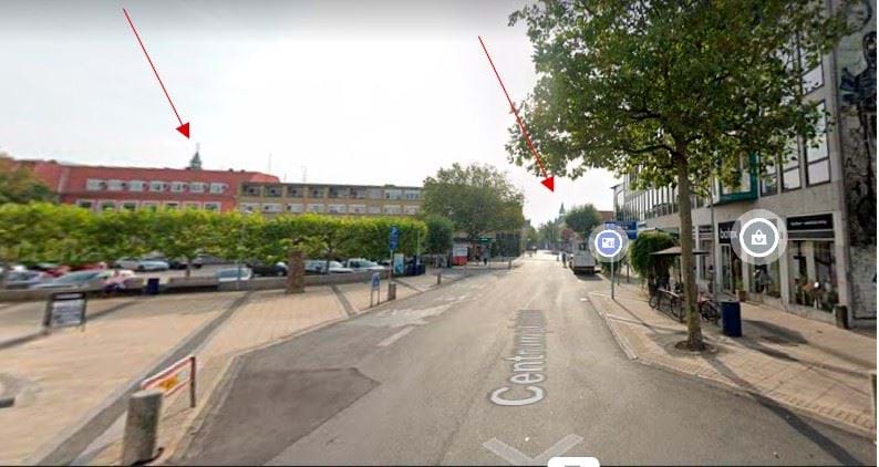 Fra Bycenter er det henover Centrumpladsen muligt at se tårnene af begge af kirker, der skimtes bag eksisterende ejendomme.