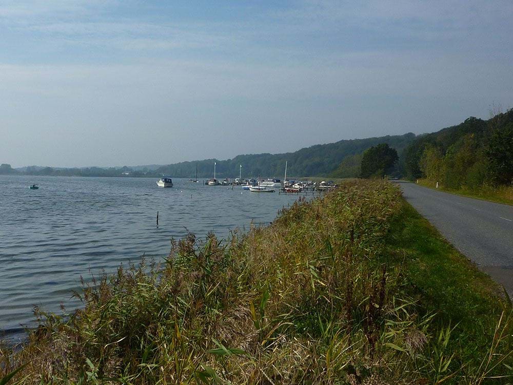 Visuelle sammenhænge på langs af kystlinjen som præges af kystvejen, skovområder og tætliggende bådebroer.