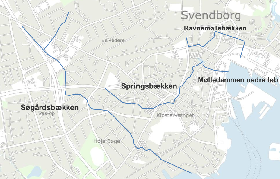 Svendborg by er tillige begunstiget af, at der springer en række kilder, hvis potentiale som permanente rekreative vandelementer kan udnyttes positivt, som en del af fortællingen om vandets hydrologiske kredsløb gennem byens terræn. I Svendborgs markante topografi vil en klog placering og indretning af de grønne og blå elementer også i mindre byggeprojekter kunne medvirke til, at oversvømmelser kan undgås og afværge, at de ikke blot gives videre til naboen. Det er her vigtigt, at planlægningen sker koordineret og i samklang med udmøntningen af udviklingen af Svendborgs masterplan for regn- og spildevandshåndtering.