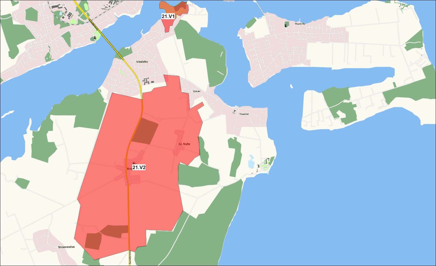Det åbne landskabsrum mellem Bregninge Skov og Vindeby danner en landskabelig ”pause” mellem Vindeby og Troense med udsigt til Svendborg By.
