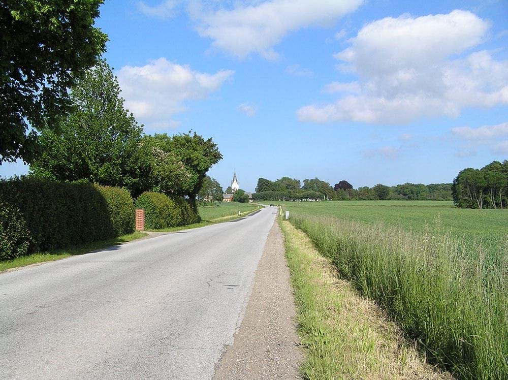 Indsigten til Lunde Kirke fra vest og øst, hvor det karakteristiske spidse kirketårn fremstår som et markant element i landskabet, vurderes som en særlig visuel oplevelsesmulighed.