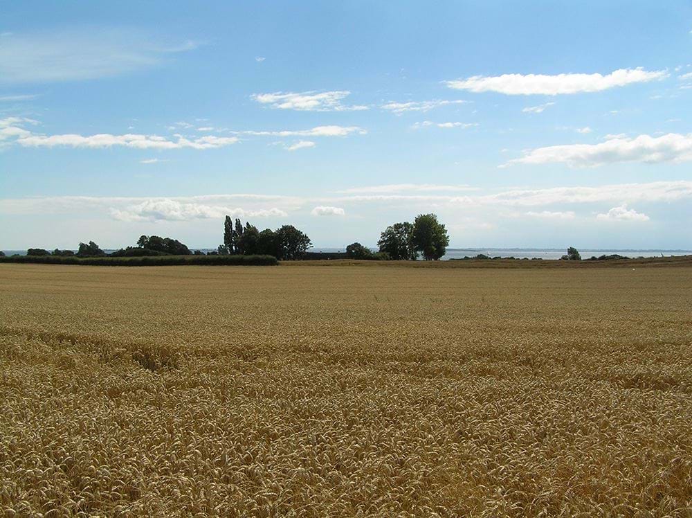 Den smalle strandbred med dyrket land der strækker sig næsten helt ud i vandet.