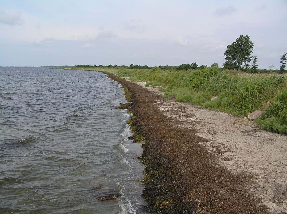 Strandbredden er smal og bevoksning langs stranden breder sig helt ud til vandkanten.
