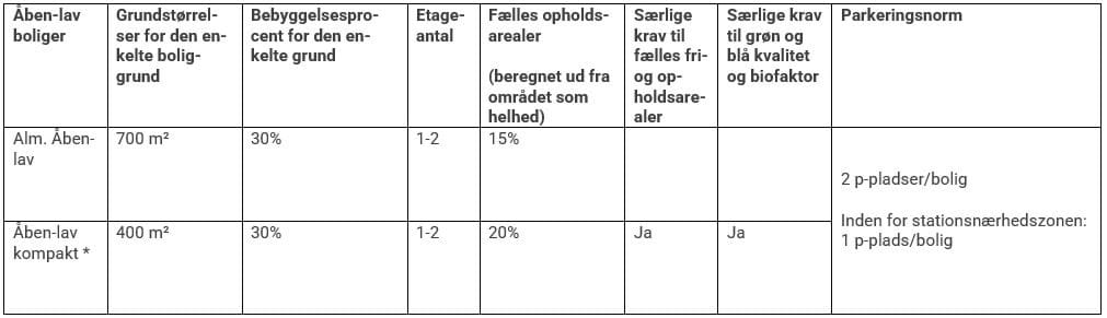 For åben-lav kompakt og tæt lav kompakt I og II stilles der udover de almindelige krav til fri- og opholdsarealerne krav om: