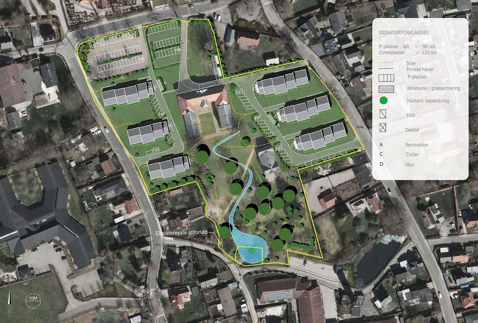 Områdets øvrige eksisterende bebyggelse må nedrives med henblik på at skabe mulighed for opførelse af ny boligbebyggelse med den oprindelige hovedbygning i centrum.