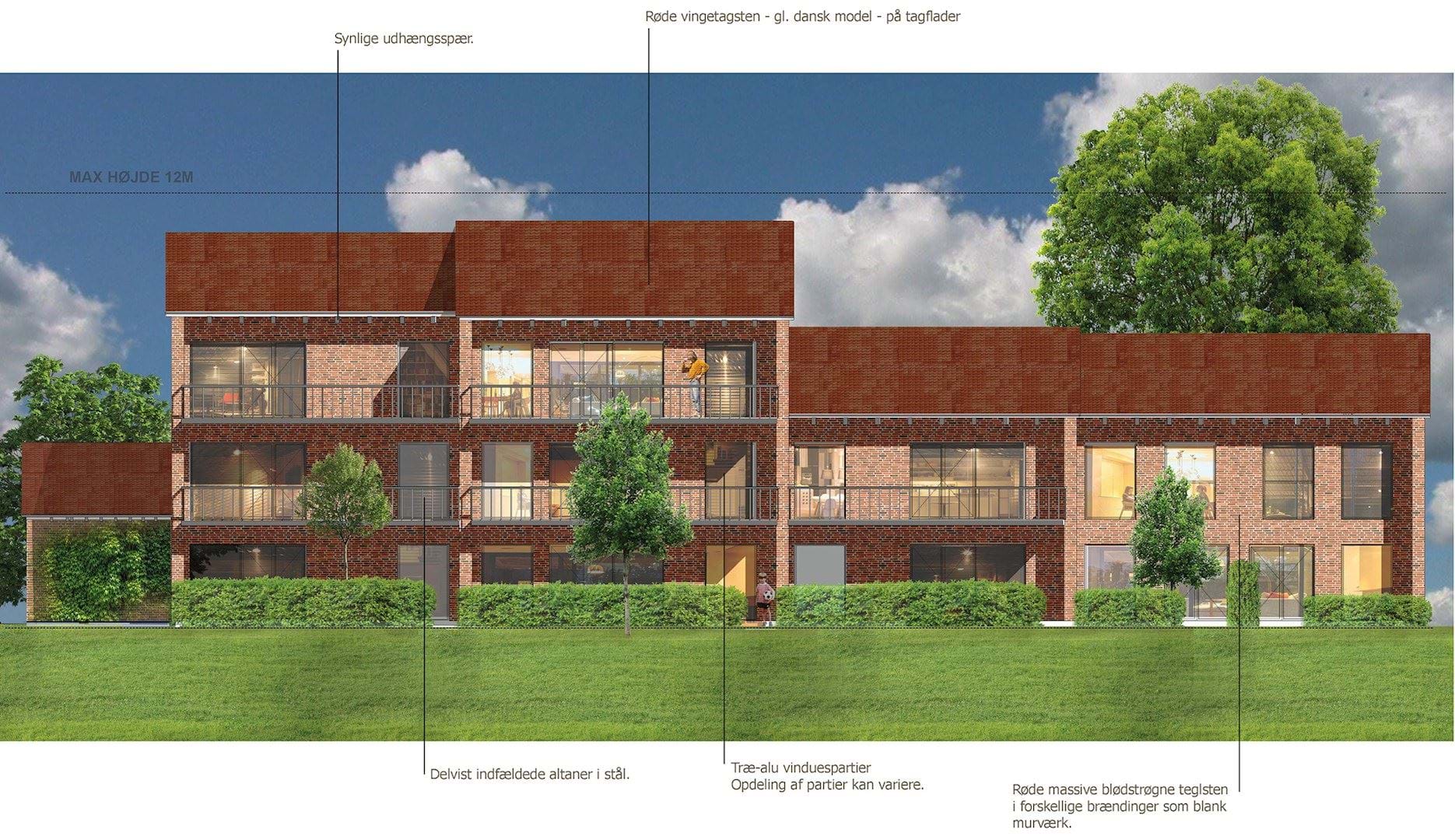 Nye etageboliger skal opføres med røde tegl som primært facademateriale, mens tage skal opføres som saddeltage med røde teglsten. Mindre bygningsdele kan udføres i andre materialer og farver, der harmonerer med det samlede udtryk. Til vinduer og døre må ikke anvendes plastrammer, da materialet harmonerer dårligt med materialevalget for områdets eksisterende bebyggelse og områdets kulturhistoriske betydning.