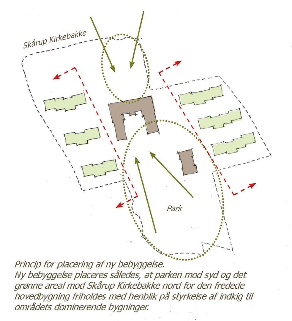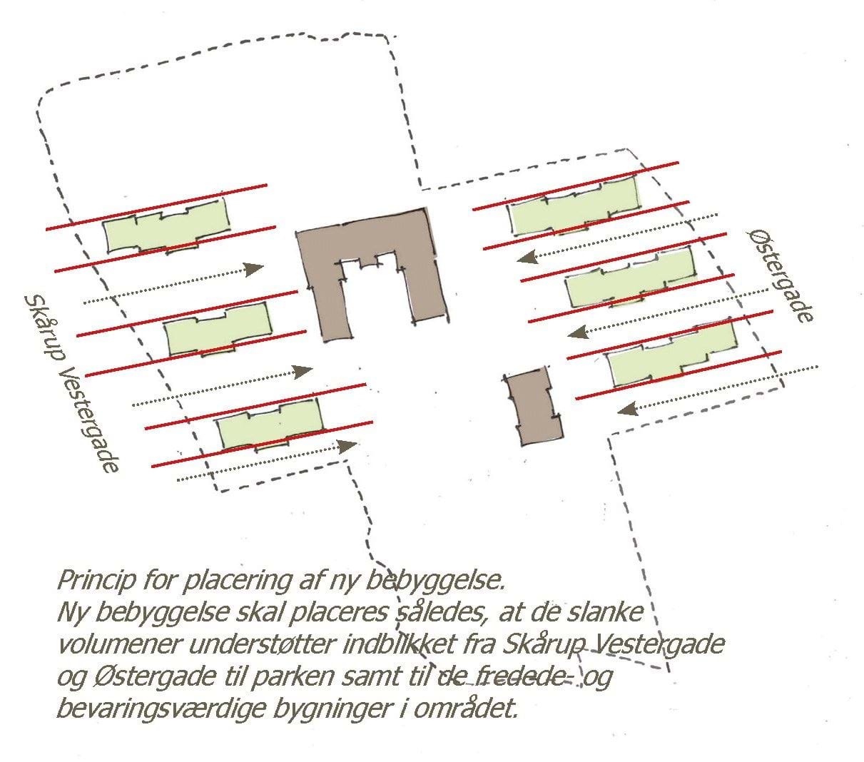 Som følge heraf udlægger lokalplanen nye byggefelter, som fastlægger placering af ny boligbebyggelse som stokbebyggelser vinkelret på hovedbygningens sidefløje og med gavle mod henholdsvis Skårup Vestergade og Østergade.