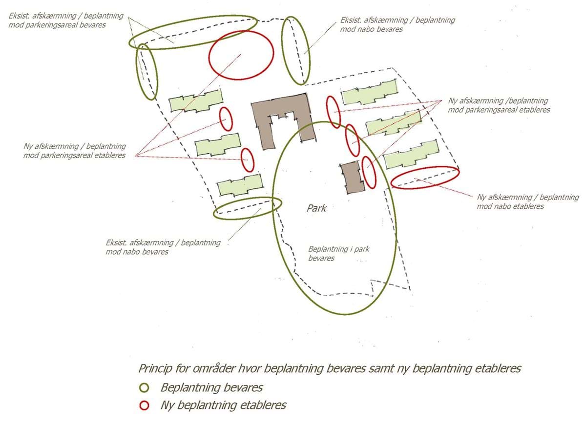 Figur 5 - Princip der viser bevaring og nedrivning af områdets eksisterende bebyggelse