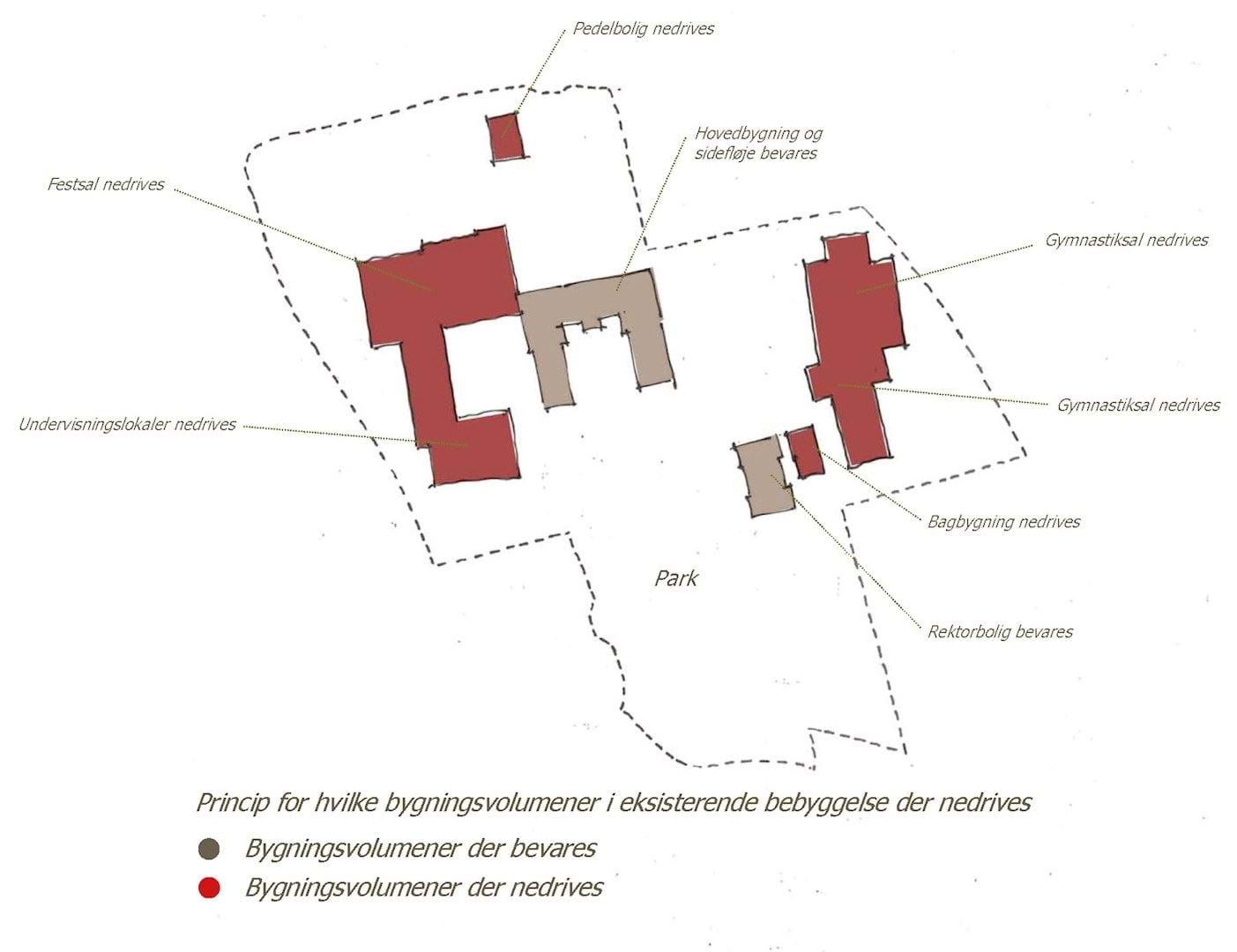 Lokalplanen stiller krav om, at hovedbygningen og rektorboligen skal bevares og ikke må nedrives.