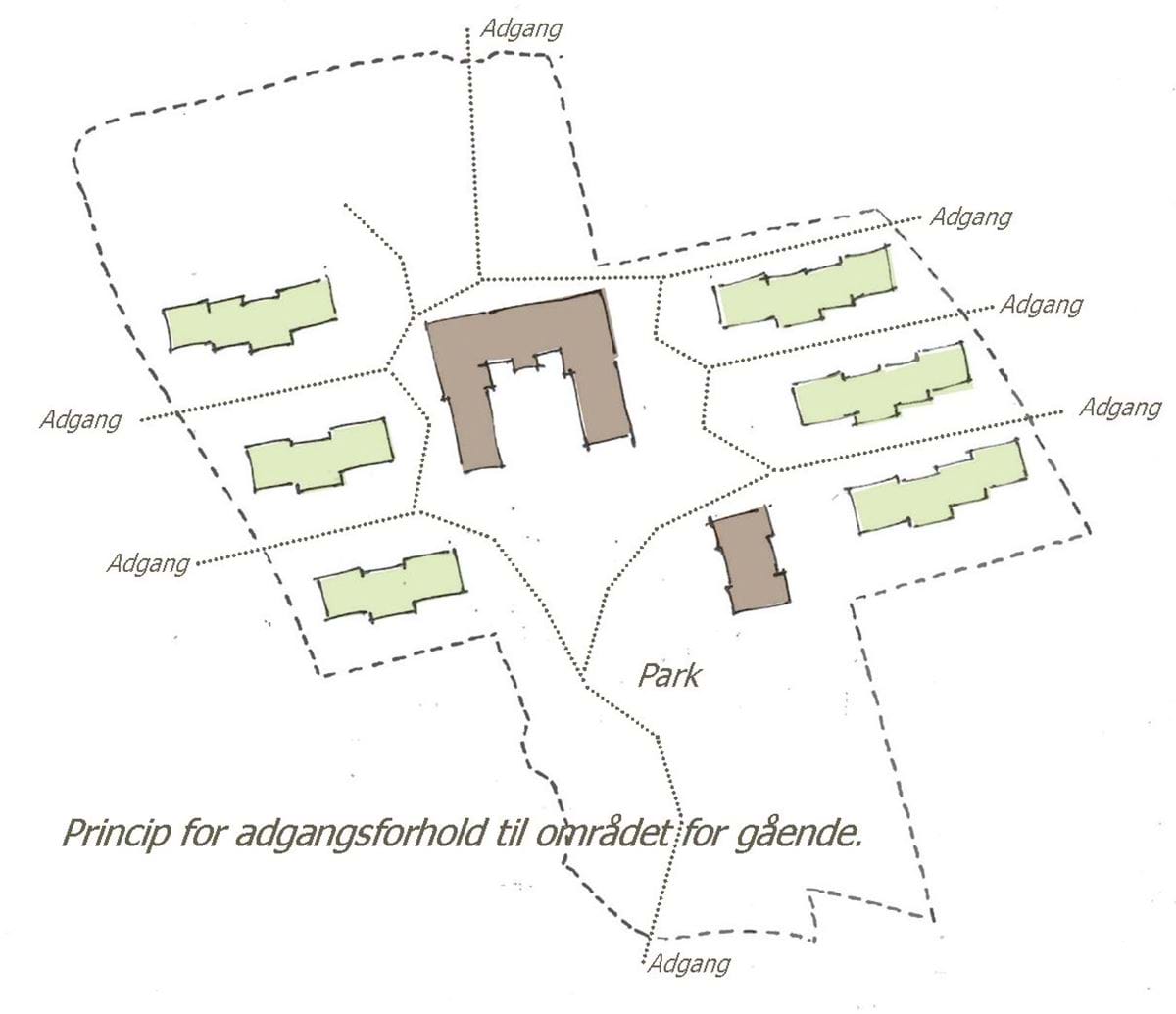 Eksisterende stiadgang fra Kærvej med stiforbindelse gennem havearealet skal opretholdes, lige som der skal etableres indgange til området fra de nye boligbebyggelser. Havearealet må ikke hegnes men skal fremstå åbent og tilgængeligt fra det omkringliggende område.