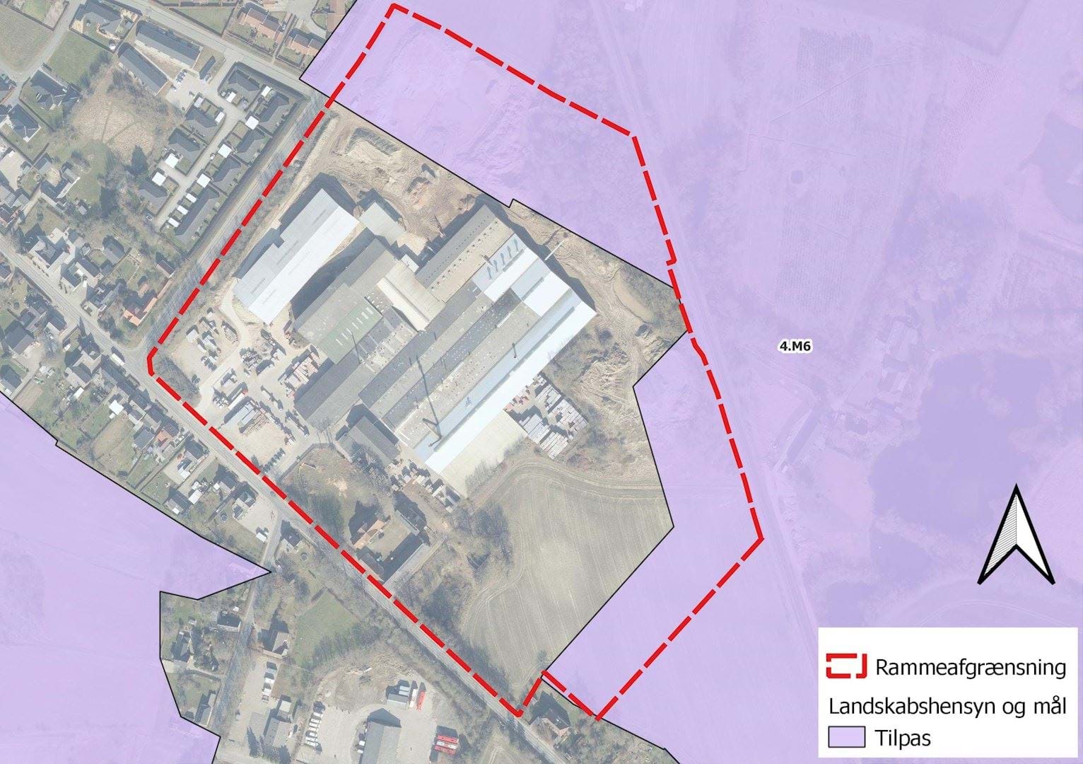 Kortudsnit der viser områdeafgrænsningen af landskabsområdet 4.M6, lokalplanafgrænsningen samt byggefelterne.