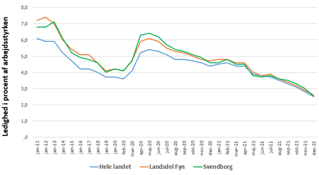 Nedenstående figur viser udviklingen i ledigheden i Svendborg Kommune. Der ses en meget positiv udvikling, som også ses nationalt og for Fyn som helhed.
