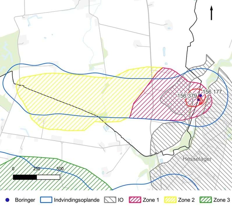 Der er afgrænset IO i nærområdet til vandværkets boringer (vest herfor). Med udgangspunkt i grundvandsdannelsen, transporttid og SGO er der udpeget 2 prioriterede zoner.