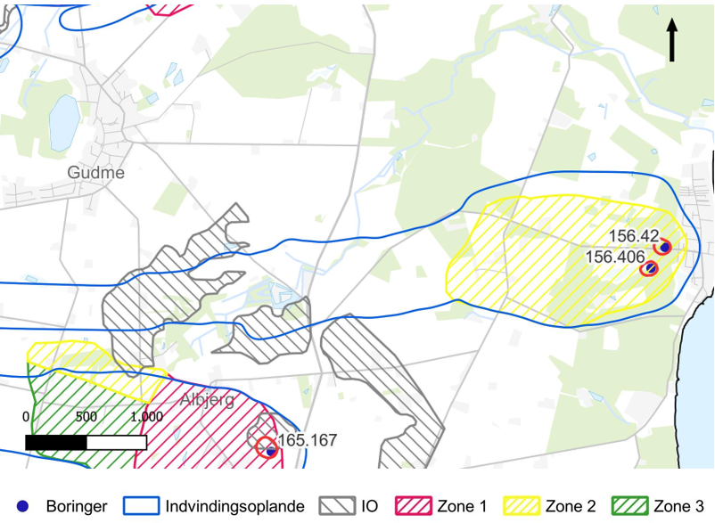 Der er udpeget indsatsområder 3-4 km vest for boringerne i det langstrakte indvindingsopland. Der er herudover afgrænset en prioriteret zone ved vandværkets boringer og vest herfor. Området er udpeget med udgangspunkt i grundvandsdannelsen, herunder SGO.