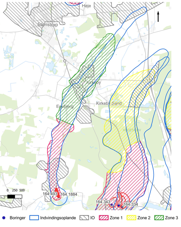 Der er i nærområdet til vandværkets boringer udpeget et IO, der strækker sig mod nord i oplandet. Længere mod nord ved Kirkeby er der ligeledes afgrænset IO. Med udgangspunkt i grundvandsdannelsen, herunder transporttid og SGO er der udpeget 2 prioriterede zoner.