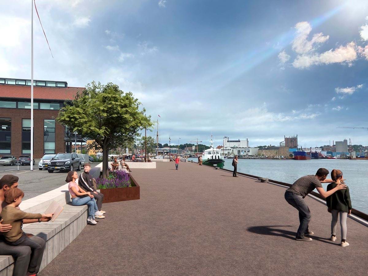 samtidig er bredt nok til at skibe der ligger ved kaj kan serviceres. Den sammenhængende stiforbindelse gennem Den Blå Kant vil således her på Gasværkskajen komme til at blive