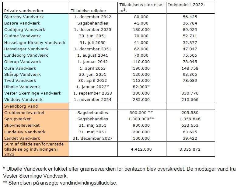 Svendborg Kommune giver løbende indvindingstilladelser til de forskellige vandværker. I nedenstående skema er der vist en status på vandværkernes tilladelser.