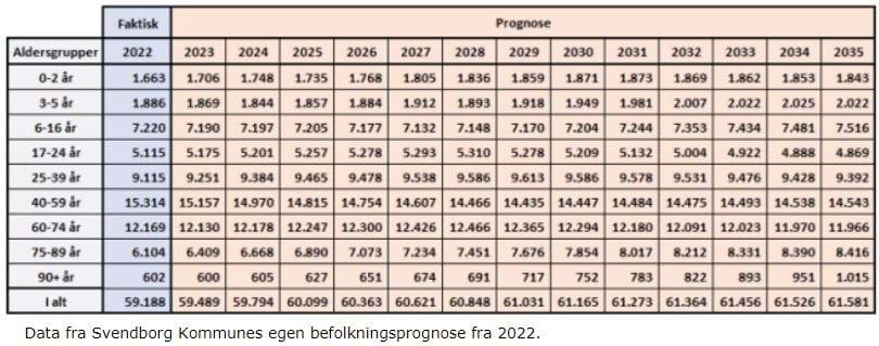 Svendborg Kommunes nuværende befolkningsprognose, i perioden fra 2022 til 2035 siger, at der vil ske en tilvækst i antallet af borger i kommunen fra 59.188 personer i 2022 til 61.581 personer i 2035. Denne gang har prognosen dog gode muligheder for at blive til virkelighed. Befolkningstallet har været stigende efter finanskrisen, og tilflytterne er bl.a. børnefamilier, så det har været nødvendigt at investere i et nyt børnehus på Thurø for at efterkomme pladsgarantien. Kommunens branding under sloganet: ’Opdag Svendborg - Kultur og natur til forskel’, Cittaslow og byvækstområdet Tankefuld mv., ser ud til at bære frugt.