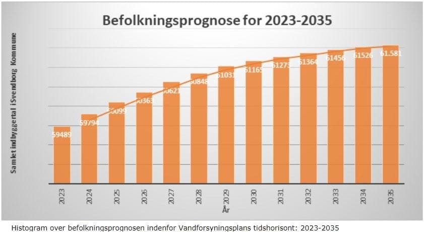 I den forrige vandforsyningsplan fra 2010 var prognosen, at indbyggertallet i Svendborg Kommune ville stige fra ca. 59.200 personer i 2009 til omkring 61.300 personer i 2021. Det var imidlertid lidt for optimistisk. I 2022 var befolkningstallet så godt som det samme, som i 2009. Det er opgjort af, der boede 59.188 personer i Svendborg Kommune i 2022.