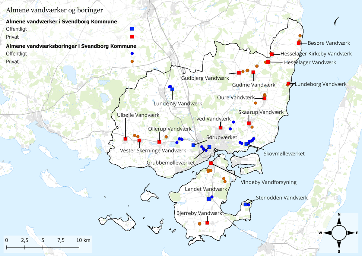 Den almene vandforsyning i Svendborg Kommune sker fra 64 boringer, hvor der i de senere år er blevet etableret enkelte nye boringer. Når nye boringer etableres, skyldes det ofte forurening i en af de ældre boringer tilknyttet vandværket.